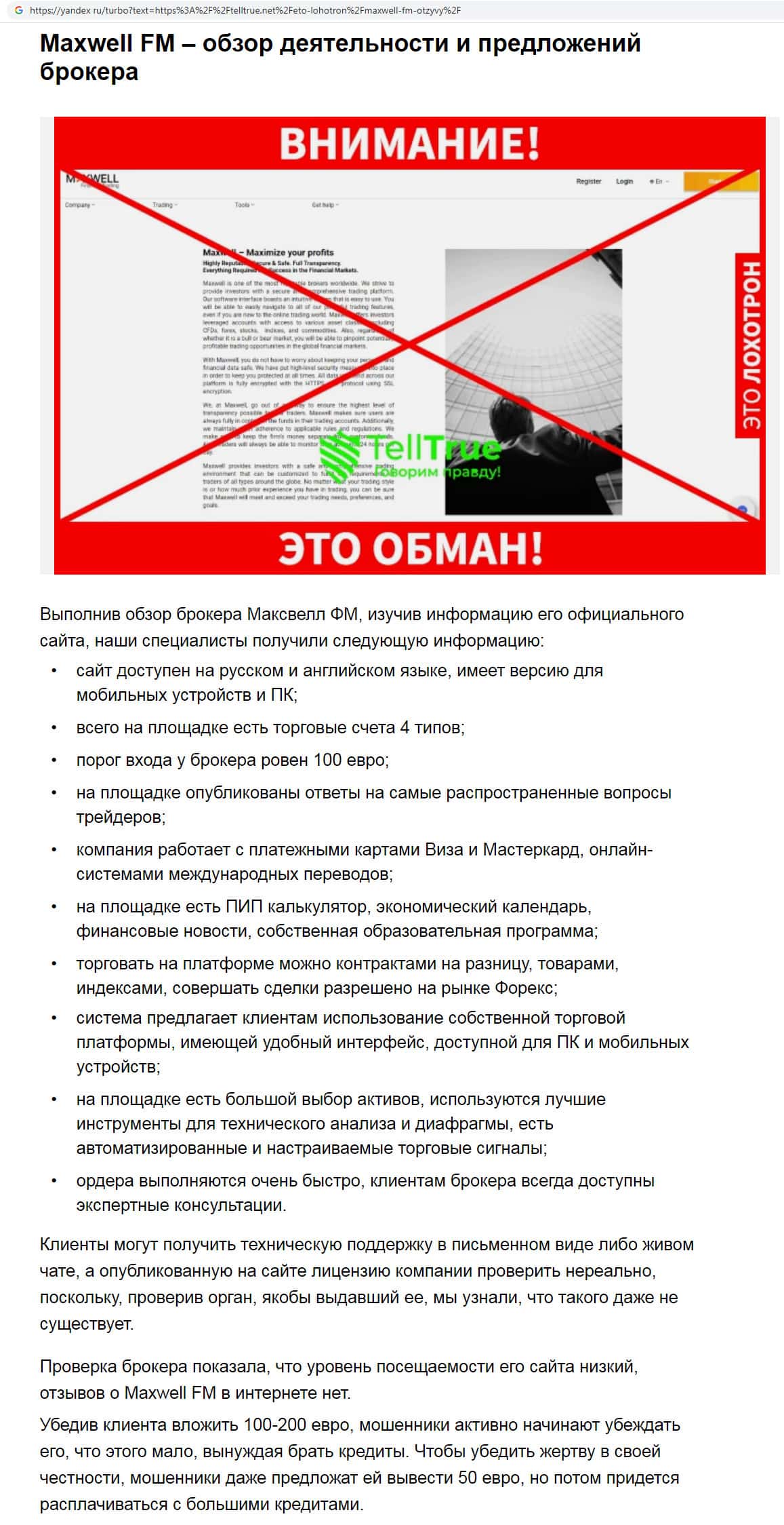 На интернет-сервисе yandex ru замечена статья-отзыв о мошенниках MaxWell Fm, которые убеждают людей брать кредиты. Для того, чтобы пользователь поверил скам-брокеру, они могут вывести с торгового счета незначительную сумму денежных средств в размере 50 евро. Все оставшиеся деньги на счете шулера Макс Велл забирают себе в карман.
