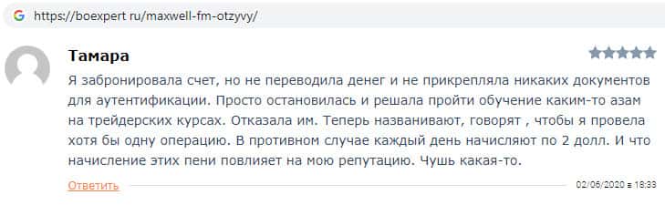 На интернет-портале boexpert ru замечен отзыв об аферистах MaxWell Fm. Автор данного комментария некая Тамара пишет, что она зарегистрировалась на их дырявой интернет-площадке и не пополняла счет. Тут же начали названивать представители данной скам-компании с угрозами о том, что оставят ее в должниках если не пополнит счет.