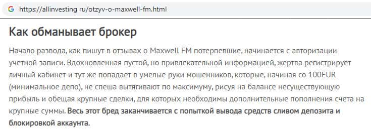 На информационном интернет-сервисе seoseed ru отыскана статья о мошеннической организации MaxWell Fm, минимальный депозит на онлайн-ресурсе которой составляет составляет 200 евро. Аферисты привыкли зарабатывать по-крупному, создавая видимость того, что их компания выплачивает регулярно бонусы.