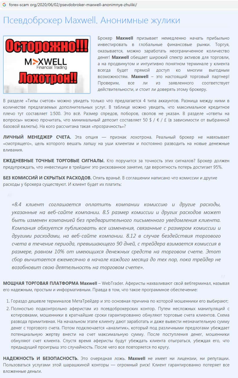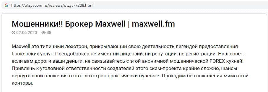 На веб-сайте отзывком ру найден отзыв о шулерах Макс Велл, которые выдумали целую легенду возникновения своей псевдо-брокерской организации. В действительности данная скам-компания не имеет лицензии для того, что чтобы предоставлять брокерские услуги. Связываться с аферистами MaxWell Fm не рекомендуем !!!