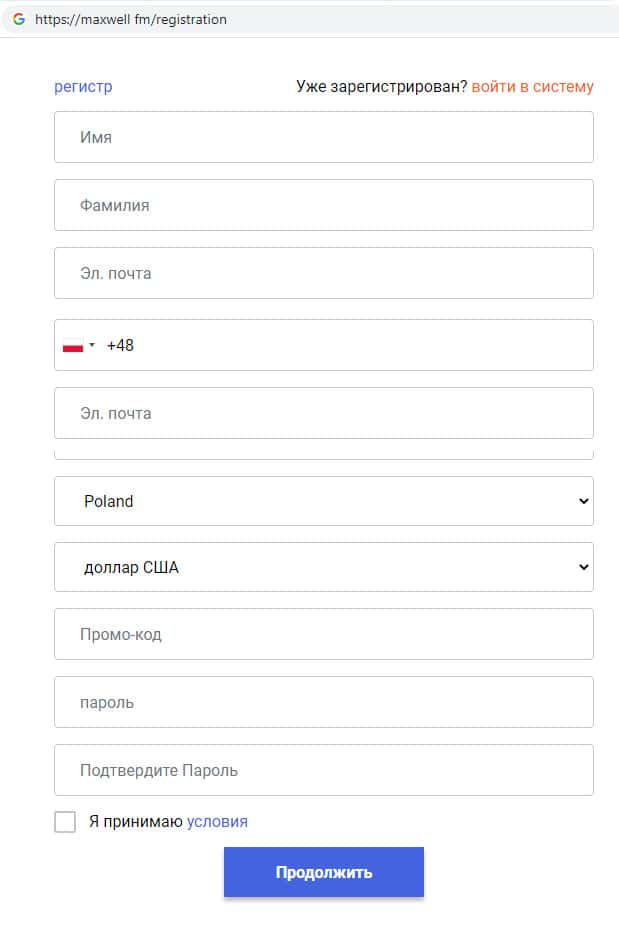 Для того, чтобы зарегистрироваться на сайте скам-организации Макс Велл необходимо назвать имя, фамилию, адрес электронной почты, контактный номер телефона и пароль, и конечно же подтвердить то, что Вы соглашаетесь с условиями пользования сайтом. Прежде чем поставить галочку в данной форме, подумайте стоит ли так рисковать своими средствами?