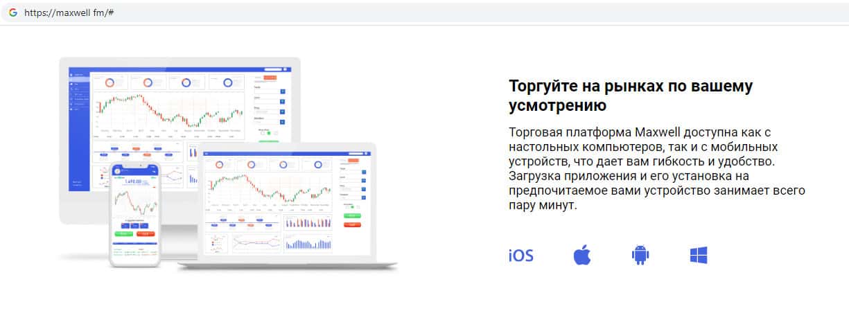 Жулики MaxWell Fm предлагают стандартную ничем не отличающуюся от подобных мошеннических платформ, где очень легко слить все свои вложенные денежные средства, а именно: торговую платформу для торговли с помощью скачанного браузера, мобильного телефона или же скачанной программы для торговли.