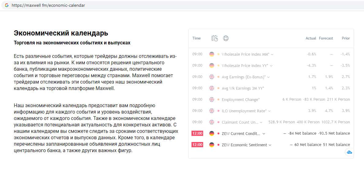 - Экономический календарь на сайте мошеннической организации Макс Велл