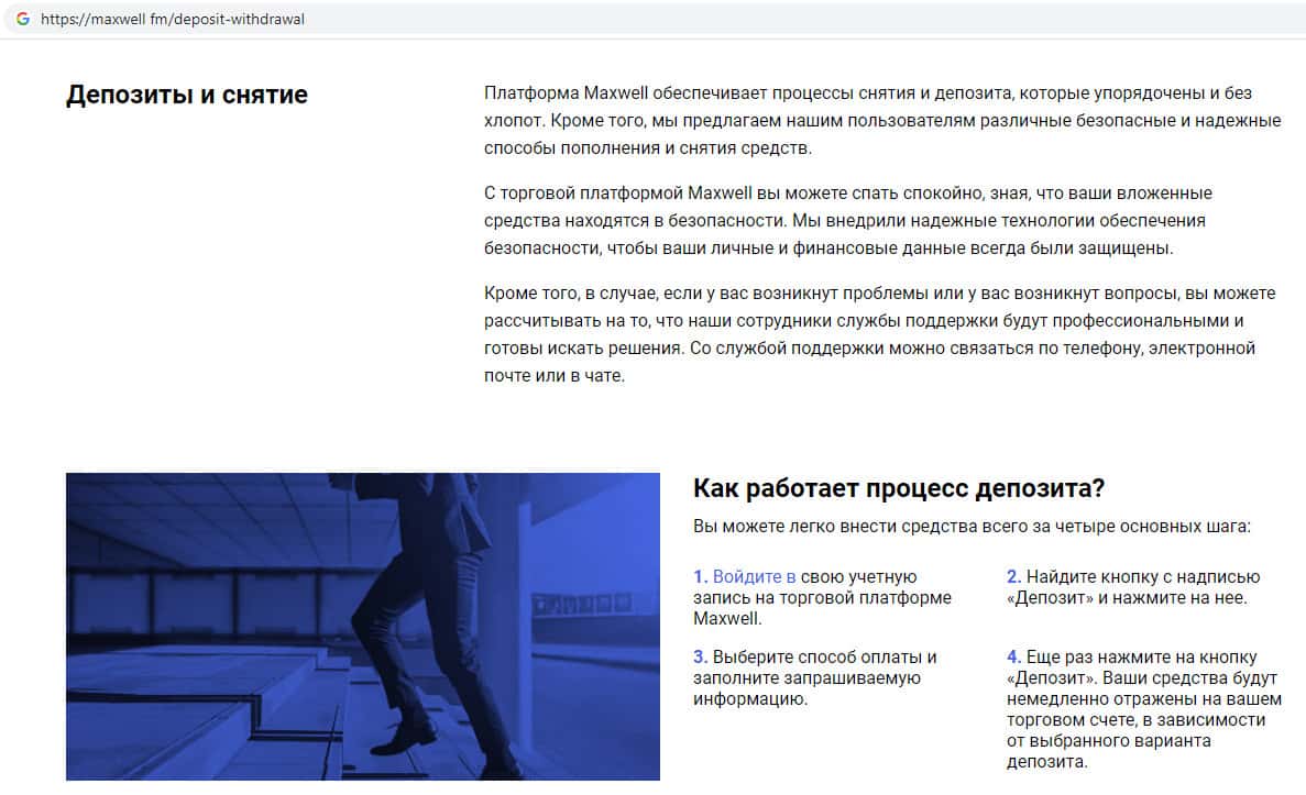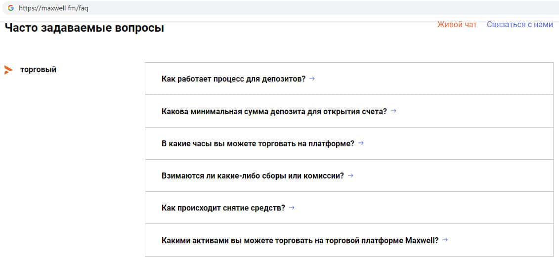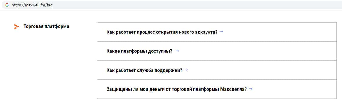 На официальном сайте жуликов Макс Велл были замечены уже продуманные всевозможные ответы на те вопросы, которые могут задавать клиенты, например в случае неудачной сделки или же каких либо проблем связанных с работой на сайте. Здесь аферисты MaxWell Fm мотивируют людей открыть торговый счет на их дырявом сайте.