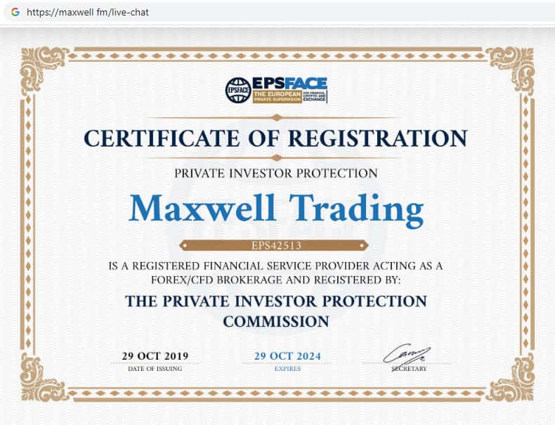 Вместо лицензии аферисты MaxWell Fm предлагают пользователю взглянуть на сертификат о регистрации компании. На самом деле данная мошенническая уловка рассчитана на невнимательного пользователя. Данный документ очень легко подделать особенно если он предоставлен в электронном варианте.
