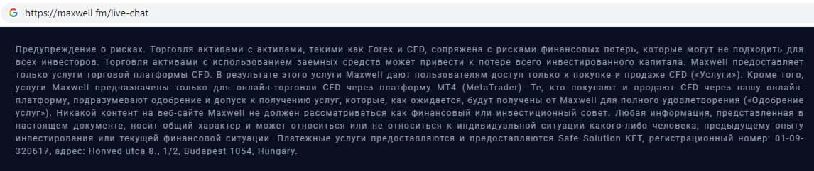 - Информация о всевозможных рисках на сайте скам-организации MaxWell Fm
