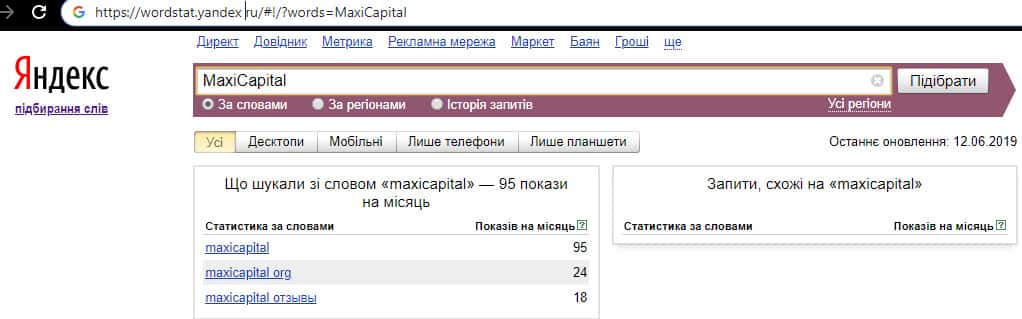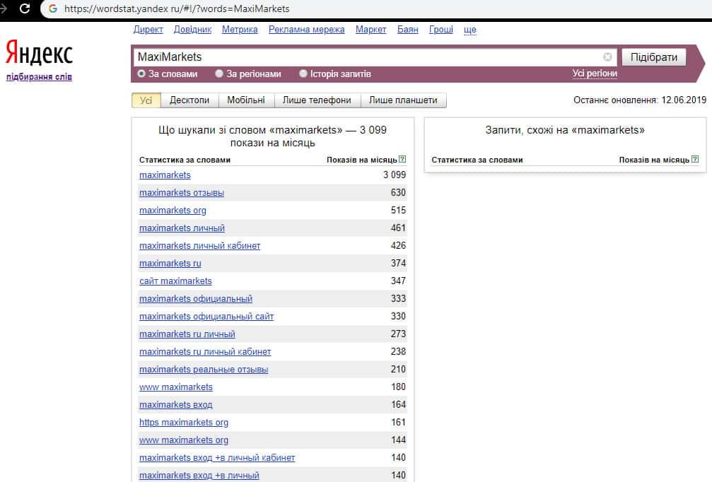 По найденным данным путем поиска через Яндекс вордстат можно сказать, что размах жульнической организации Макси Кепитал колоссальный, а их же напарником выступают и Макси Группс. Не связывайтесь с подразделениями и группировками такого кидалова, как МаксиМаркетс, чтобы не лишиться финансовых средств.