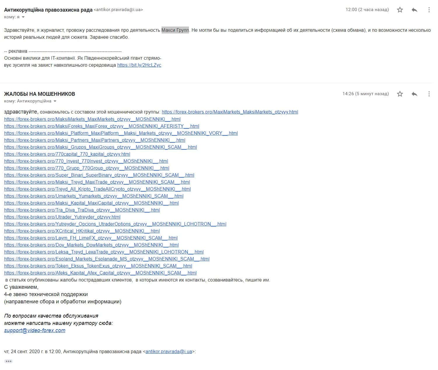 Далее опубликован скрин письма, которое прислали украинские журналисты на емайл сайта-разоблачителя в том числе и мошенников Форекс, на данный момент проводится расследование мошенничества компании Макси Групп.