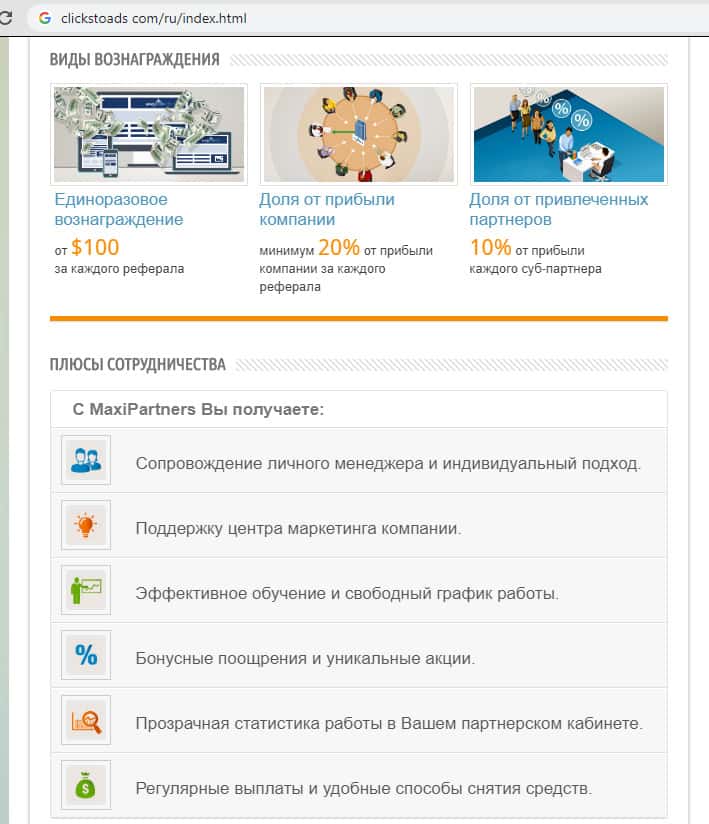 На изображении ниже вы можете увидеть какие преимущества предлагает ресурс clickstoads, напарником которых являются и аферисты Макси Группс. Столько времени и сил, а может и нервов наивная клиентура тратит на такие группировки опасной мошеннической конторы МаксиМаркетс, поэтому настоятельно рекомендуем не связываться с подобными кухнями.