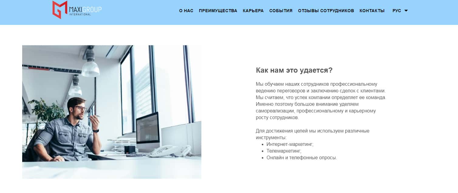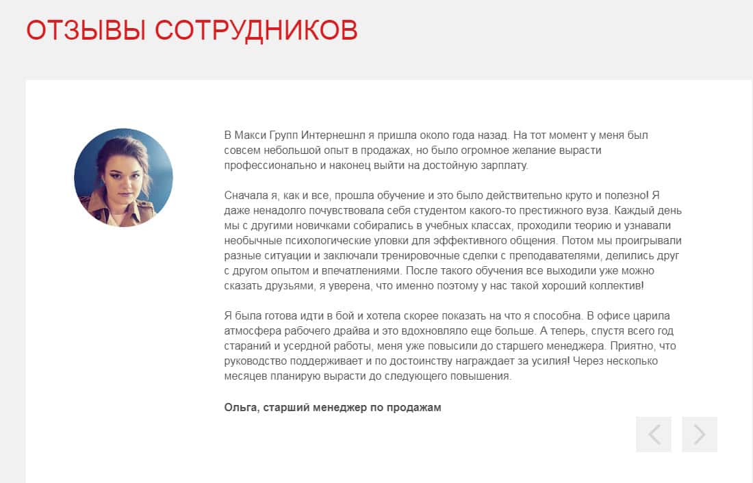В связи с мошеннической и противозаконной деятельностью аферистов Макси Группс (Макси Маркетс) на своем же официальном сайте мошенники решили подделать отзывы сотрудников, дабы внушить доверие наивной клиентуры, а затем стандартным путем, вешая лапшу дальше, обанкротить их.