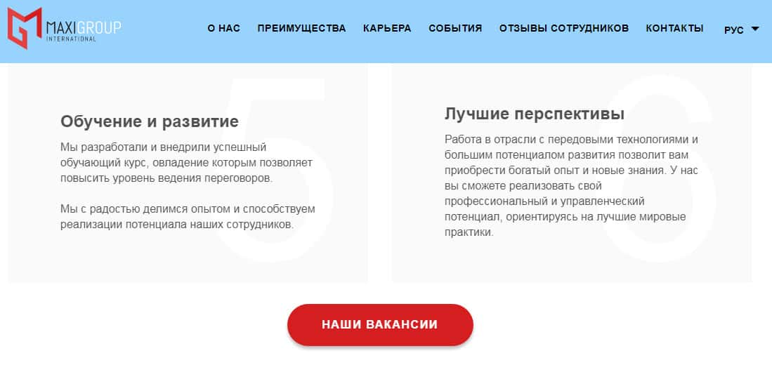 В разделе карьеры, администрация напоминает о своих шикарных возможностях и разработанных новых технологиях, заставляя верить доверчивых клиентов тому, что внедрение их в деятельность подвальной кухни Макси Группс (Макси Маркетс) позволяет вести прозрачные и честную деятельность. Как бы не так!