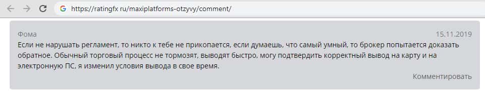 "Если не нарушать регламент, то никто к тебе не прикопается, если думаешь, что самый умный, то брокер попытается доказать обратное. Обычный торговый процесс не тормозят, выводят быстро, могу подтвердить корректный вывод на карту и на электронную ПС, я изменил условия вывода в свое время." - вот как пытается пользователь Фома переложить вину с МаксиПлатформ на их кинутых клиентов.
