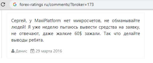 "Сергей, у Maxi Platform нет микросчетов, не обманывайте людей! Я уже неделю пытаюсь вывести средства на заявку, не отвечают, даже жалкие 60$ зажали. Так что делайте выводы ребята." - вот что говорит пользователь под ником Денис о работе с мошеннической кухней Макси Платформ без всяких преукрашений, всё по факту и разобрано. Не дадим мошенникам жить за наши деньги!
