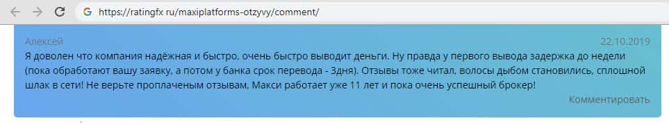 Пользователь Алексей не имеет ни капли стыда, вот что он пишет:"Я доволен что компания надёжная и быстро, очень быстро выводит деньги. Ну, правда у первого вывода задержка до недели. Отзывы тоже читал, волосы дыбом становились, сплошной шлак в сети! Не верьте проплаченным отзывам, Макси работает уже 11 лет и пока очень успешный брокер!"