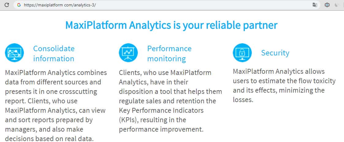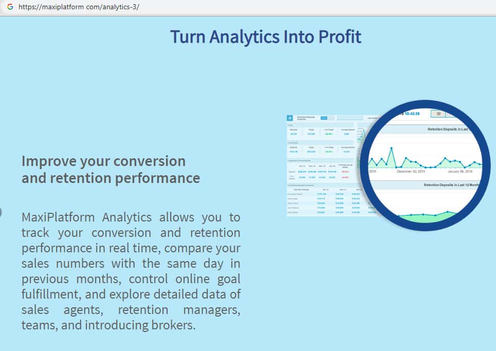 Аналитический раздел платформы (Maxi Platform Analytics) по заявлениям "разработчиков" объединяет данные из разных источников и представляет их в одном сквозном отчете. Клиенты его использующие, смогут просматривать и сортировать отчеты, подготовленные менеджерами компании, а на их основе принимать решения для удержания показатели эффективности (KPI).