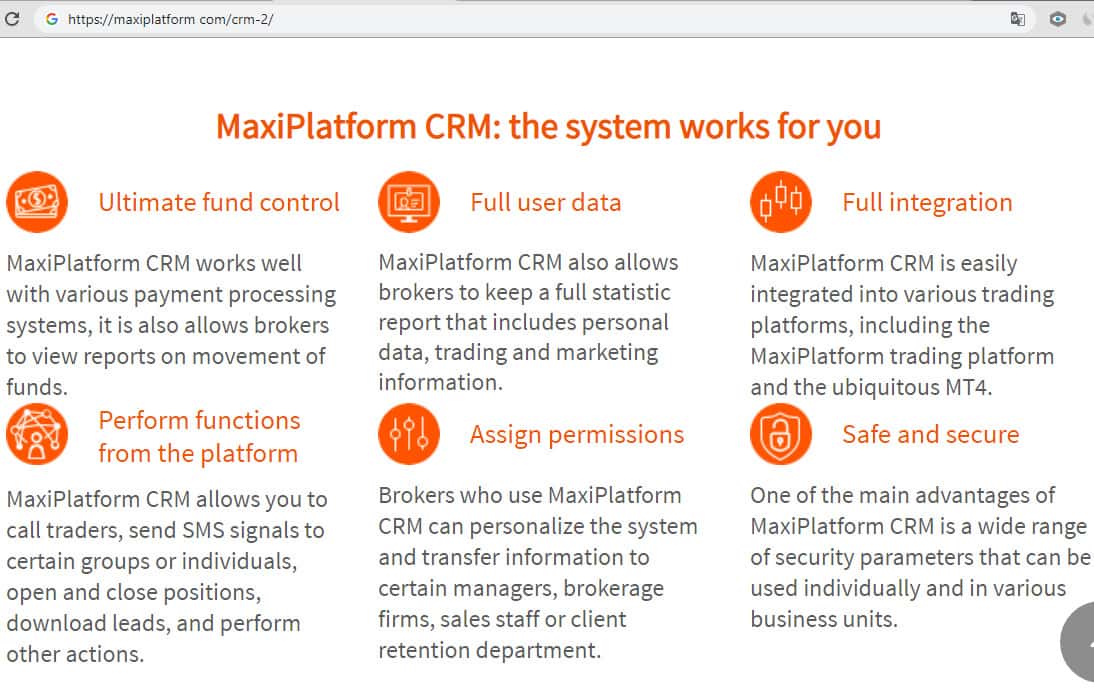 Система CRM от MaxiPlatform позволяет передавать информацию определенным менеджерам, брокерским фирмам, сотрудникам отдела продаж, трейдерам, отправлять SMS-сигналы определенным группам или отдельным лицам, открывать и закрывать позиции, загружать лиды и выполнять другие действия.