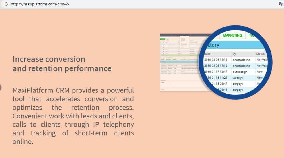 CRM от Макси Платформ по заявлению администрации работает с различными системами обработки платежей, и позволяет брокерам просматривать отчеты о движении денежных средств, позволяет вести полный статистический отчет, который включает в себя личные данные трейдеров, информацию о их торговле и маркетинге.