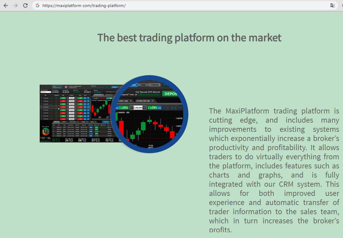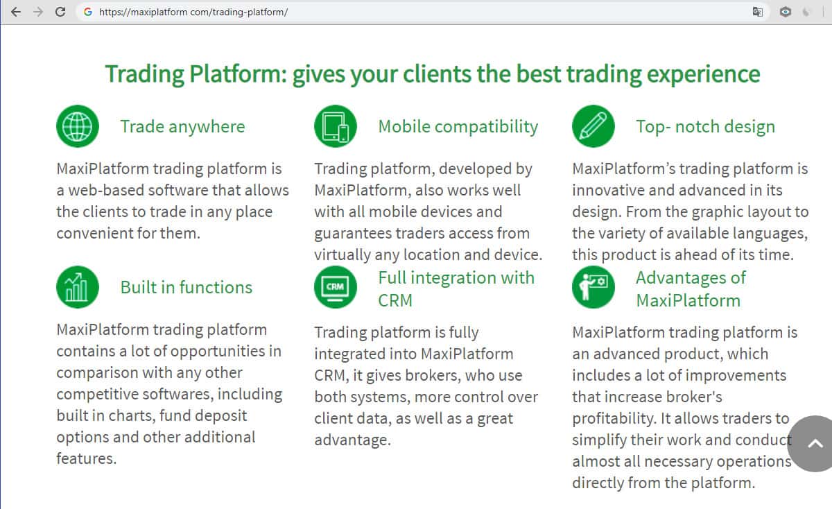 Аналитический блок и блок CRM могут поставляться отдельно и интегрироваться в стороннюю торговую платформу, а могут быть поставлены вместе с торговой платформой Макси Платформ. Она позволяет трейдерам делать практически все с платформы, включает в себя такие функции, как диаграммы и графики, и полностью интегрирована с системой CRM.