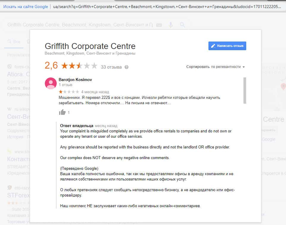 Но, что примечательно! На каждой странице портала содержится Gооgle-карта с указанием офисного центра Griffith Corporate в Кингстауне Сент-Винсента и Гринадин. А она имеет 33 отзыва. Все отзывы написаны с гневом и болью обманутых клиентов, а им отвечает администрация центра: "мол, извините, мы лишь предоставляем офисы в аренду."