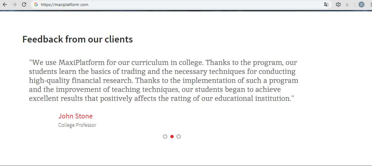Создатели сайта Макси Платформ для повышения солидности организации поместили три ярких отзыва о компании, её торговой платформе и службе технической поддержки. Естественно, все отзывы положительны, выдуманы мошенниками и не базируются на никакой действительной истории.
