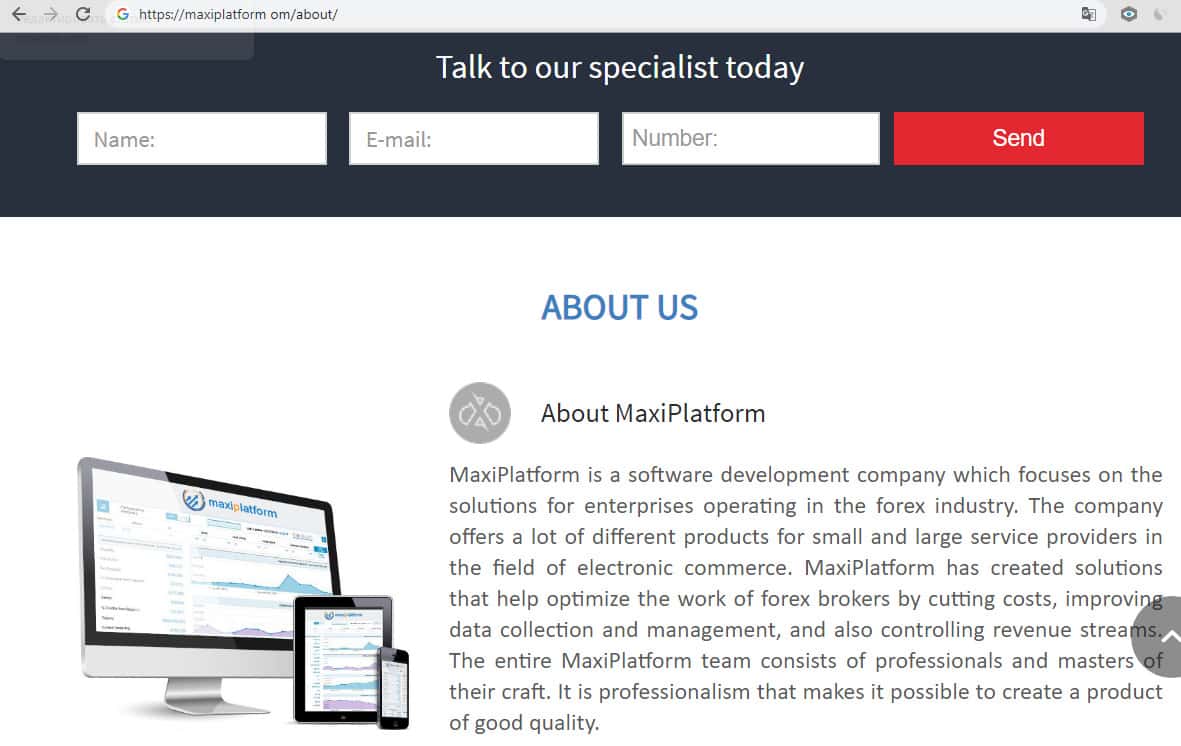 Что же о себе ещё говорят мошенники? Страница портала Макси Платформ, озаглавленная "о нас" ничего нового не несет, а лишь повторяет уже сказанное о своей торговой платформе и в очередной раз предлагает оставить свои контактные данные для возможного общения с менеджерами компании. В этом и заключается вся уловка мошенников, как следует из отзывов о компании.