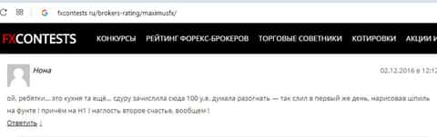 Данный отзыв нам описал, для чего работает контора Максимум ФХ и что от них ожидать, если вы уже попались в их лапы. женщина повелась на уговоры менеджера MaximusFX о золотых горах и вложила 200 долларов. Понятное дело, что аналитики довели счет до нулевого значения и больше на связь не выходили.