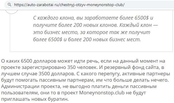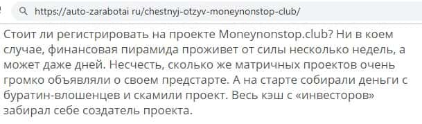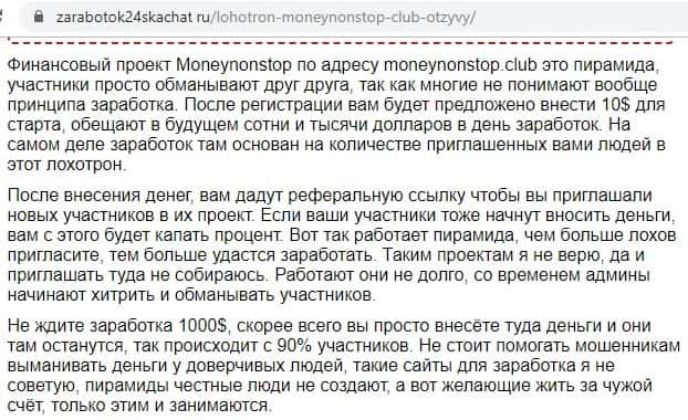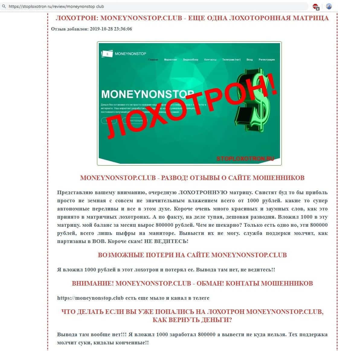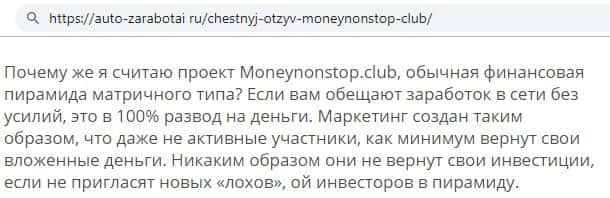 - Финансовый проект Money NonStop Club - это лохотрон, по мнению веб-сайта stoploxotron ru