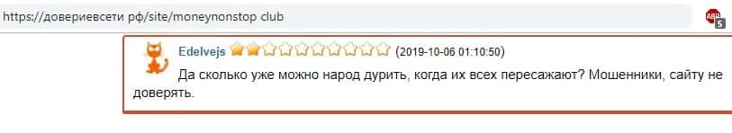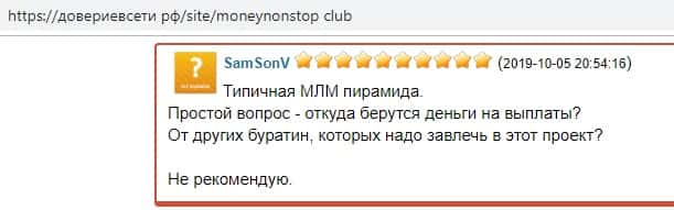 Негативный отзыв о финансовой пирамиде Мани НонСтоп на интернет-сайте довериевсети рф