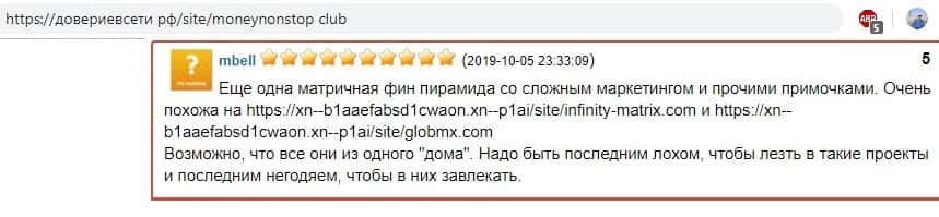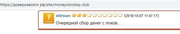 Коротко, но ясно, Money NonStop Club - ЛОХОТРОН, об этом выражает свое мнение обманутый пользователь этой финансовой пирамиды на странице интернет-портала довериевсети рф.