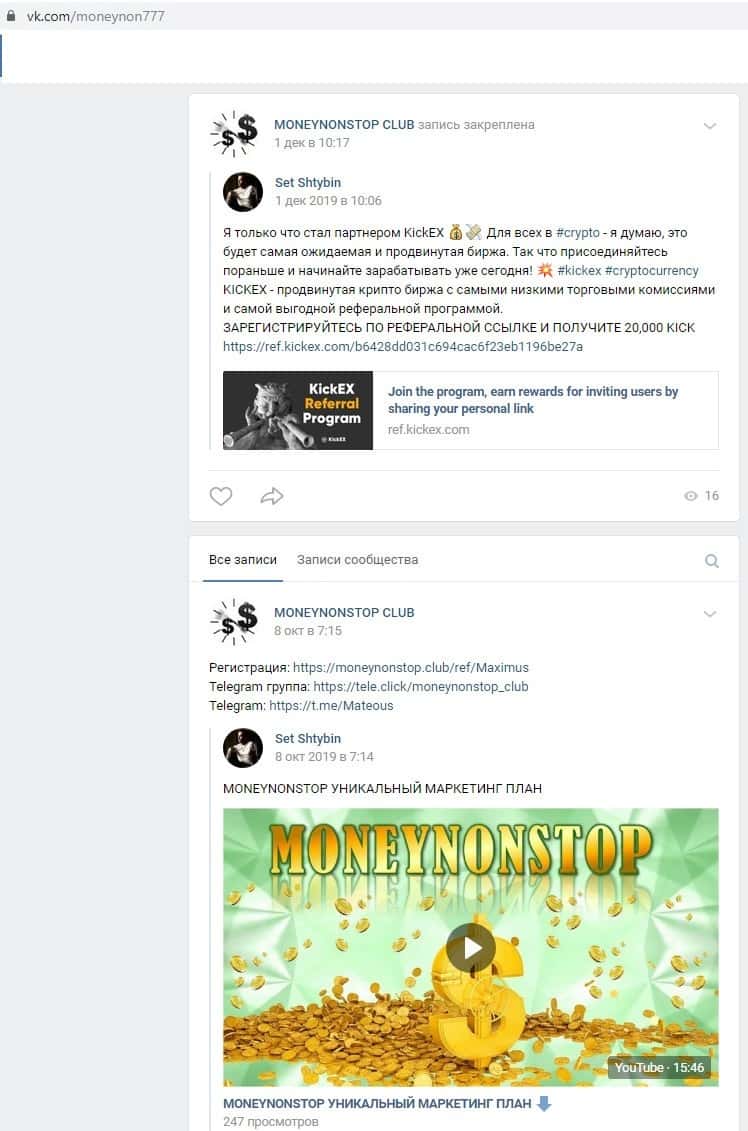 - Мошенники из Money NonStop Club ведут активную деятельность в социальных сетях