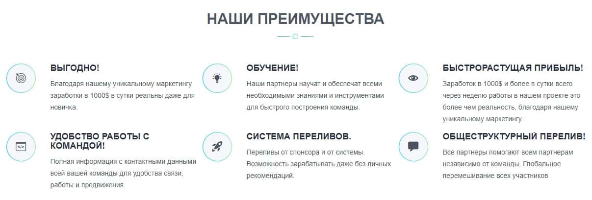 Вместо подробного описания концепции финансовой деятельности компании Money NonStop Club и разъяснения правил участия в проекте, на официальном сайте мошенников мы видим только рекламу преимуществ.
