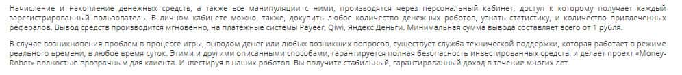 Также брокер запарился Money-Robot Pro и описал, как он функционирует. Видимо, чтобы главная страница не пустовала: ничего информативного в этих двух абзацах нет, они просто разжёвывают информацию, которую знают уже и первоклассники. А о выводе от 1 рубля контора пишет видимо специально, чтобы клиенты не отчаивались.