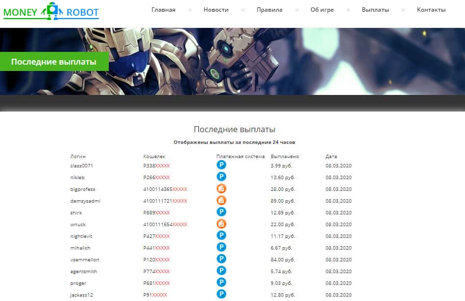 Раздел "Выплаты" пестрит сфабрикованными никами, номерами счетов и суммой выплаты. Замануха заключается в том, что потенциальные клиенты начинают верить, что деньги им действительно будут выплачивать. Но если просмотреть сумму выплат, все вопросы отпадают: с такими ботами вы уходите в минус и не более, средние выплаты там 20 рублей.