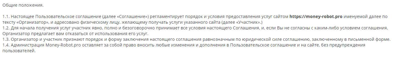 - Клиентское соглашение шулеров Money-Robot Pro типичное для обманщиков на рынке