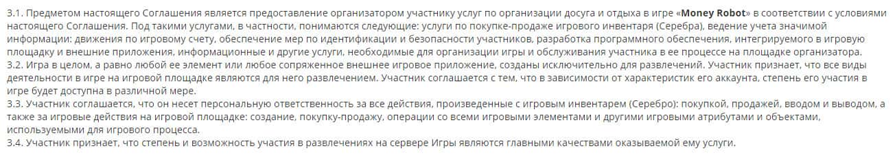 Жульё Мани Робот представляет в официальных документах свою деятельность прежде всего, как игру, а не как источник дохода. Главной задачей игры является принести удовольствие и разбавить досуг. То есть, вся ответственность за операции с реальными деньгами с помощью их ботов они с себя снимают: это ведь игра.