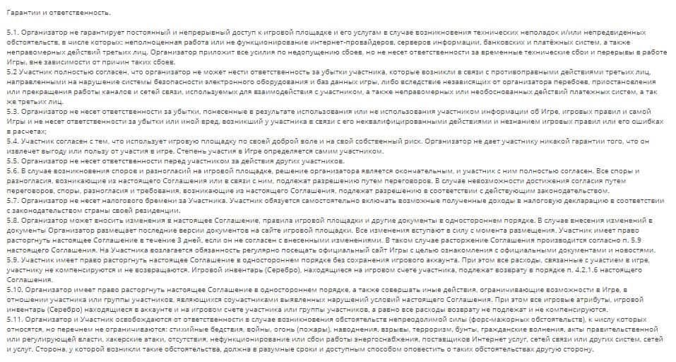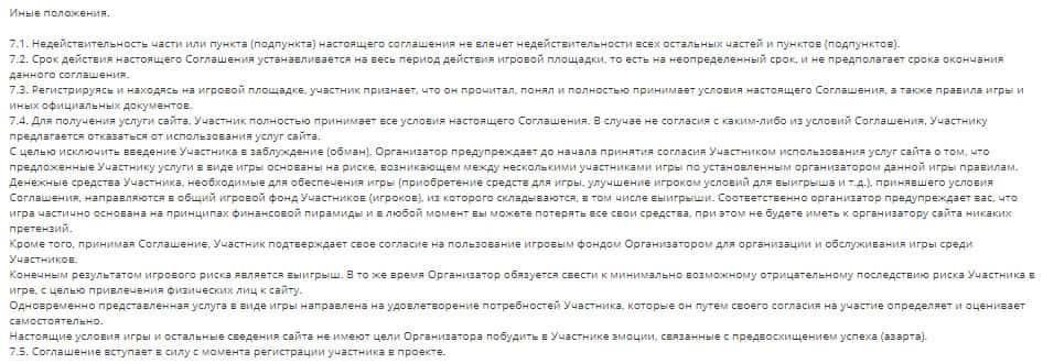 На данный вопрос ответ нам дают некие иные пункты соглашения, в которых говорится, что "игрок" полностью признаёт, что игра частично основана на принципах финансовой пирамиды, а это означает, что за все убытки от обмена валютой на данной платформе несёт сам игрок и конторой Мани Робот они выплачиваться не будут.