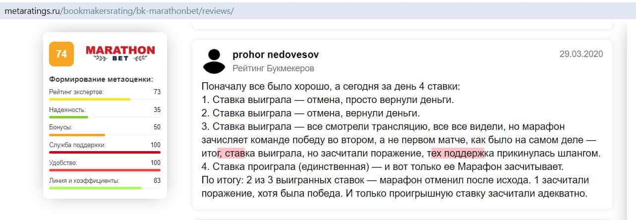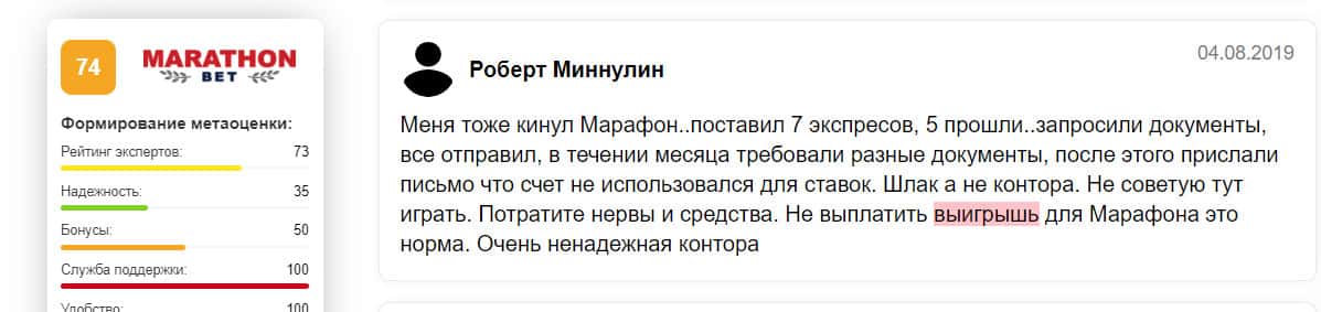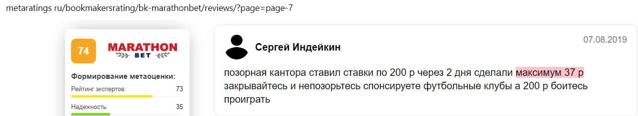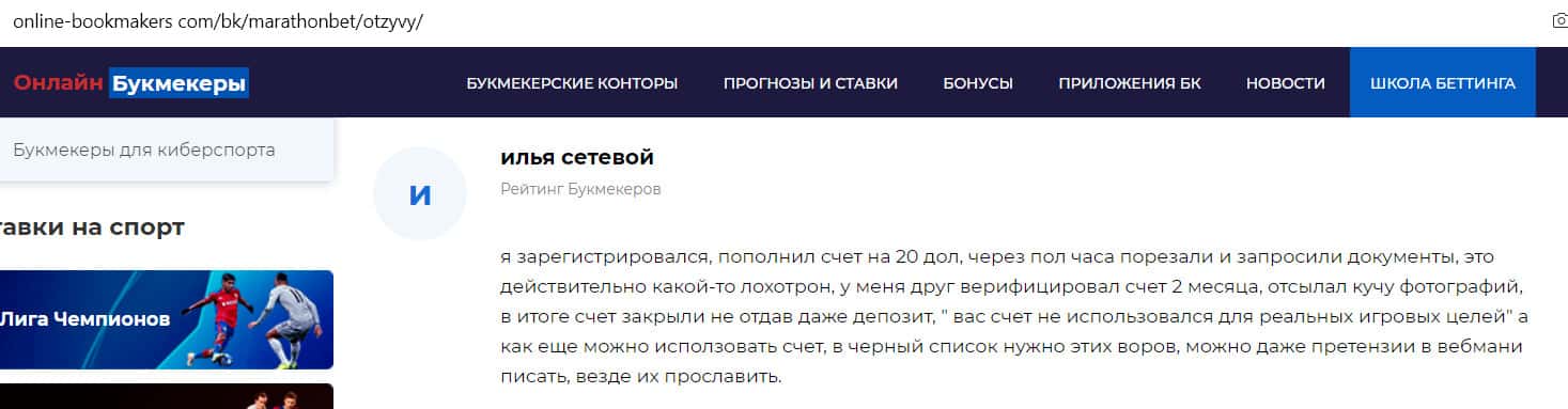 Отрицательный отзыв о конторе Марафон Бет на сайте sports ru