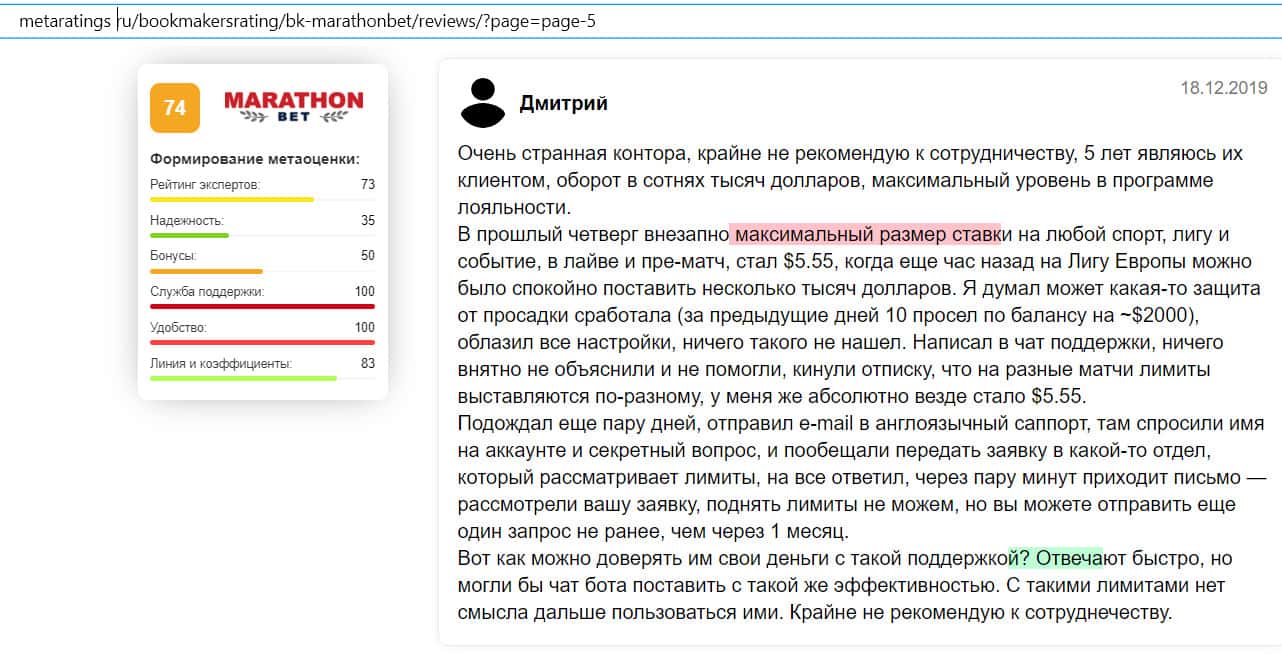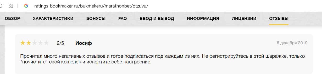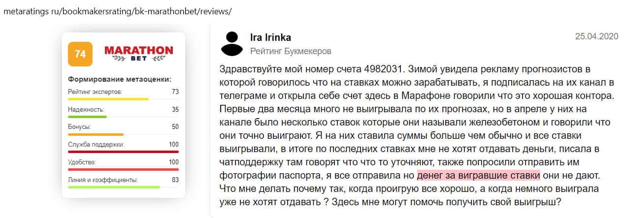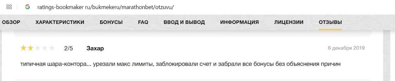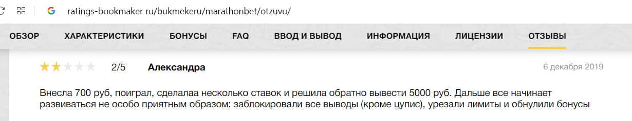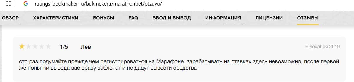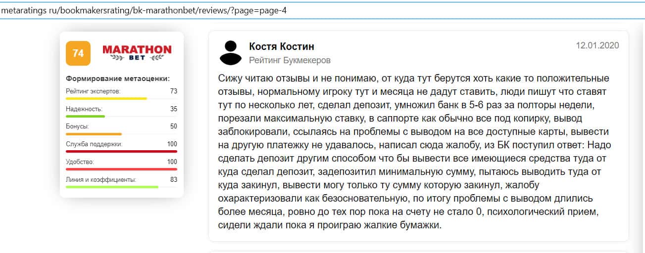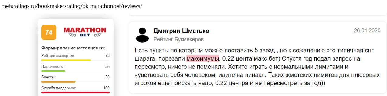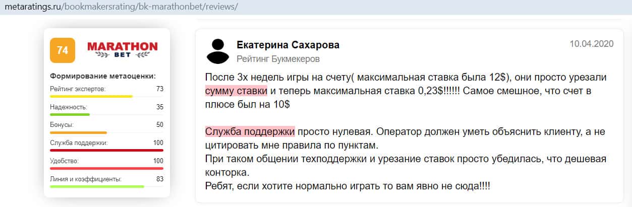 Негативный отзыв на сайте ratings-bookmaker ru о БК MarathonBet