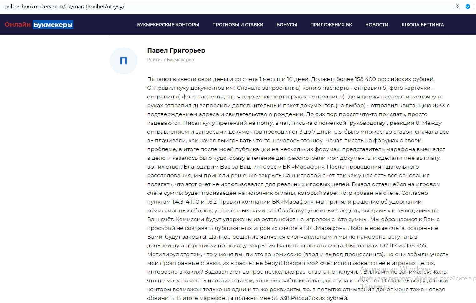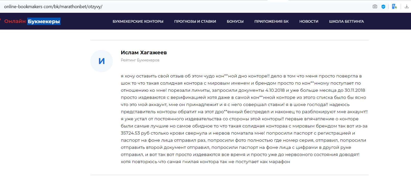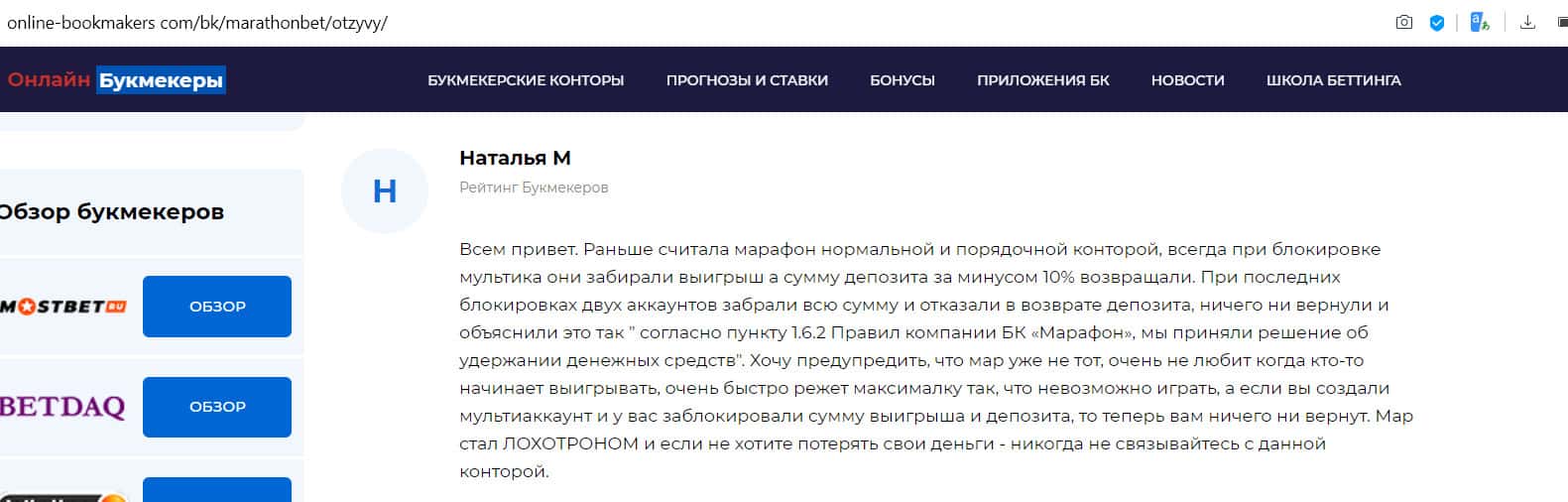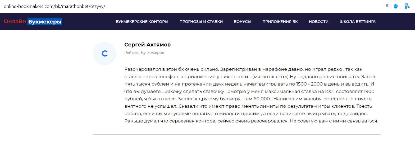 Негативный отзыв на сайте ratings-bookmaker ru о БК MarathonBet
