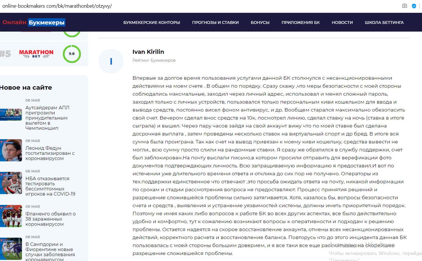 Пользователь оценил безопасность сайта MarathonBet как нулевую