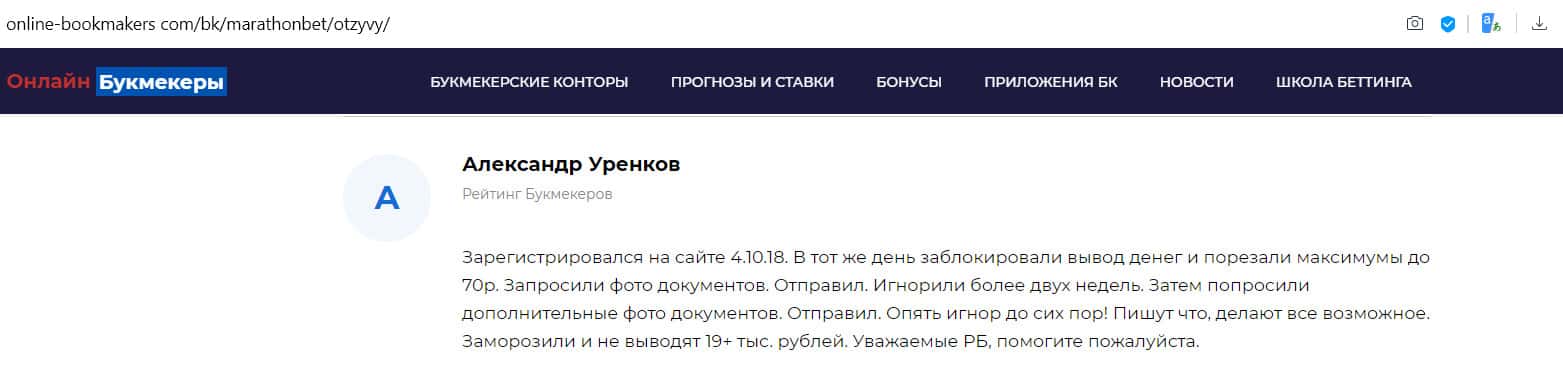 - Пользователь рассказал о своем негативном опыте с площадкой MarathonBet
