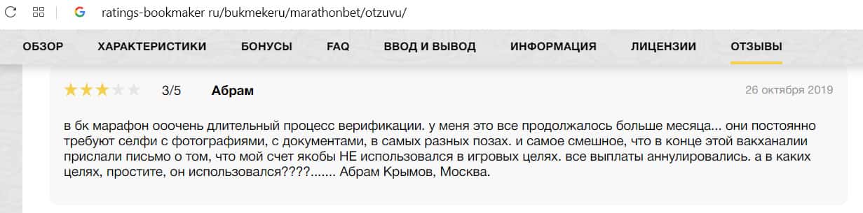 Абрам написал на сайт ratings-bookmaker ru о неадекватных действиях администрации Марафон Бет. По его словам, он долго не мог пройти верификацию, его заставляли фотографироваться в разных позах. После чего прислали ответ, что его счет не использовался для игры. Выплаты игрока аннулировали.