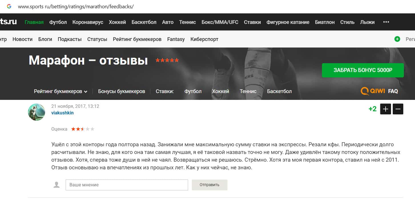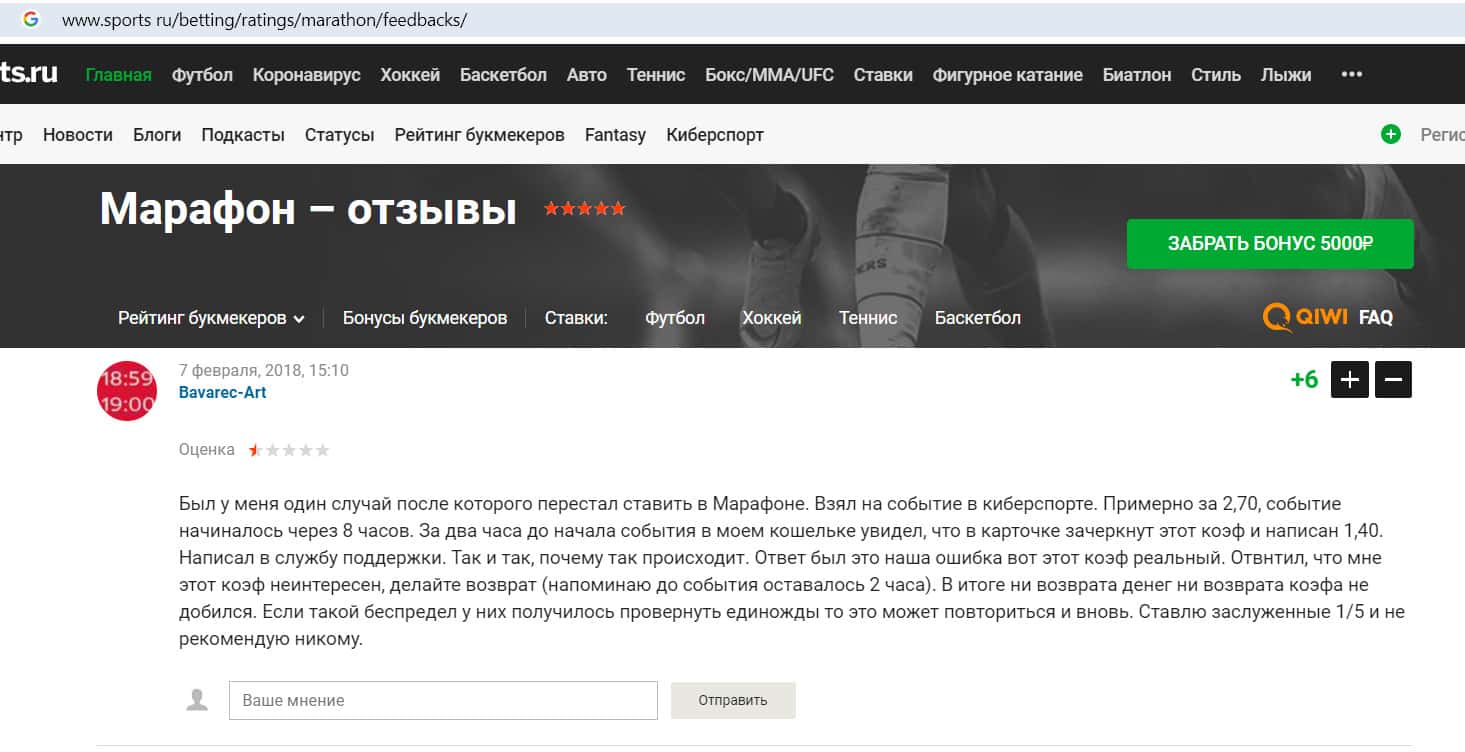 - Отрицательный отзыв о конторе Марафон Бет на сайте sports ru