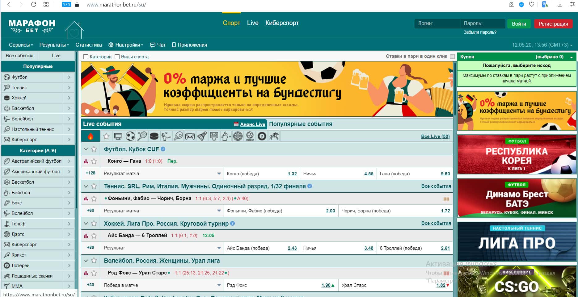 MarathonBet - одна из крупнейших букмекерских контор в РФ. Их сайт можно охарактеризовать как стандартный ресурс для ставок на спорт. Многие игроки ставили ему хорошую оценку, до того момента, как мошенники начали сливать всех подряд. Кроме росписи событий, на сайте имеются настройки и статистика.