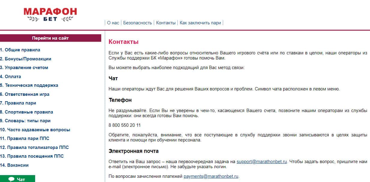 Связаться с организацией Марафон Бет можно несколькими способами. Например, написать на имейл: [email protected] или позвонить по телефону: 8 800 550 20 11. Также есть отдельный имейл по вопросам зачисления платежей: [email protected]. Имеется чат со службой поддержки.