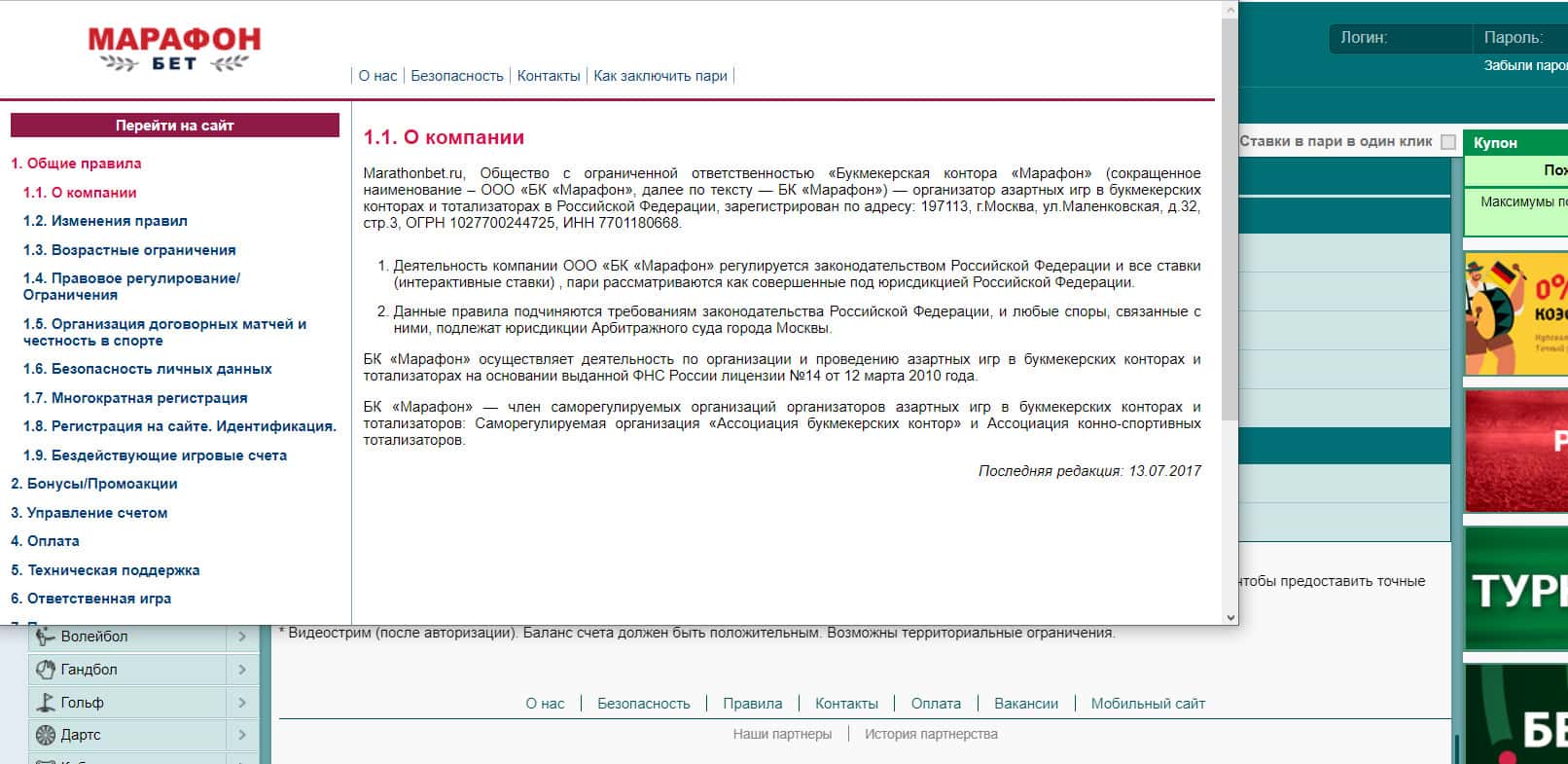 - Пользовательское соглашение организации Марафон Бет