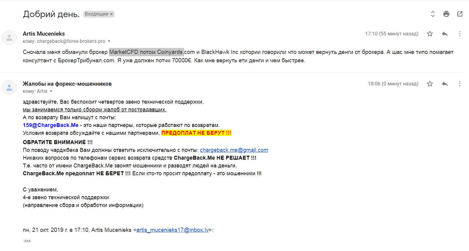 Жалоба на MarketCFD, Coinyards и Брокер Трибунал - мошенники повесили на человека долги