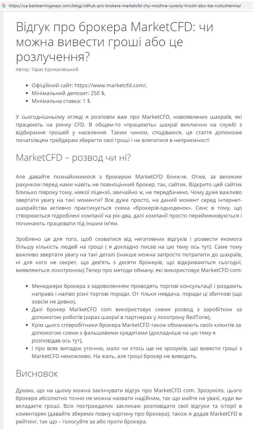 - Статья-отзыв о брокерской организации MarketCFD найдена на веб-сайте bestearningways com
