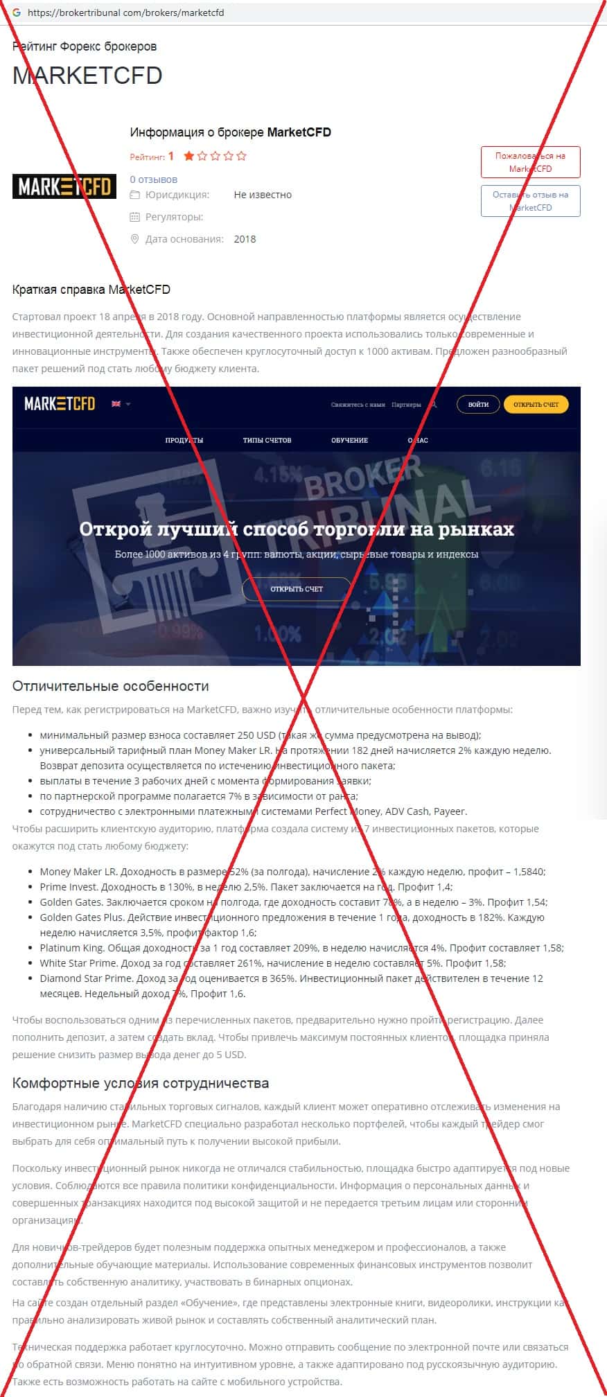 На сайте brokertribunal com была найдена статья с фальшивой информацией о брокере Маркет ЦФД. Возможно мошенники компании MarketCFD сами о себе размещают подобные статьи, поскольку правдивой негативной информации об их организации и так достаточно.