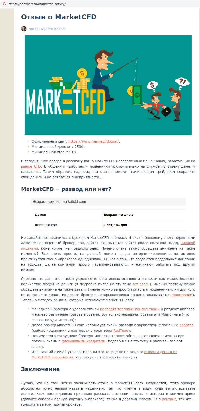 - Отзыв некого Виктора о скам-брокере MarketCFD найден на веб-сайте boexpert ru